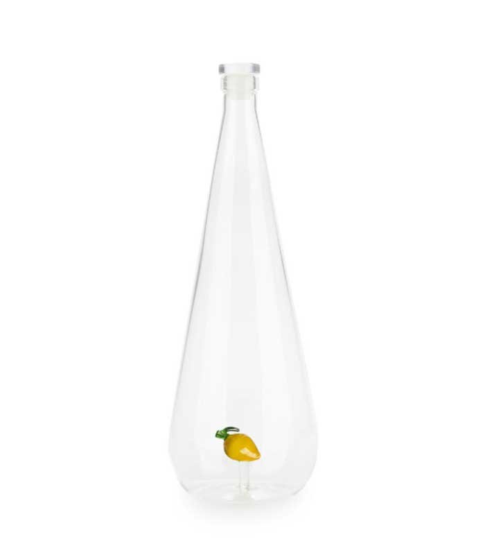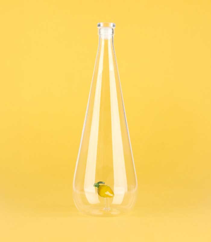 ¡Un toque de frescura y estilo en cada sorbo! Esta botella de vidrio con forma de gota cuenta con un encantador limón hecho a mano en su interior, añadiendo color y personalidad a tu mesa.