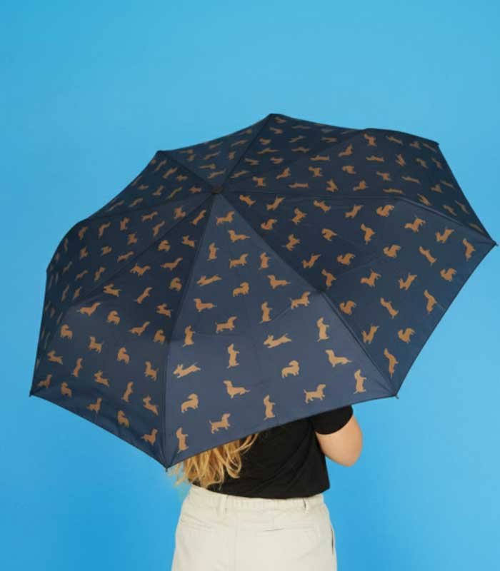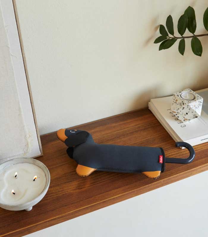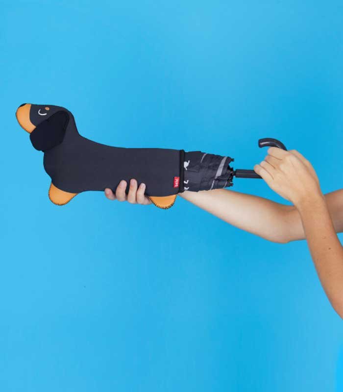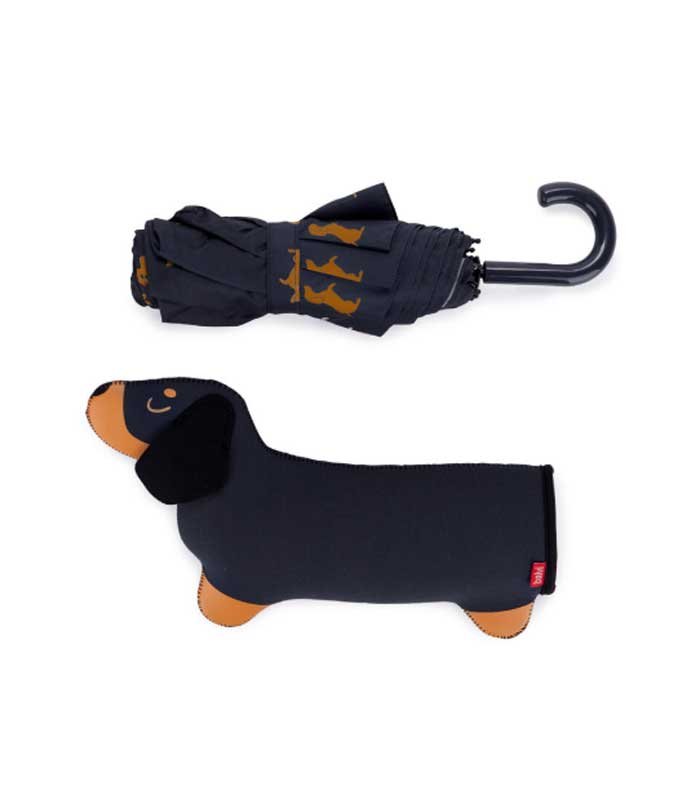 ¡Se acerca una lluvia de ternura! Con funda en forma de teckel y mango que simula la cola del perro, este paraguas combina diseño original, practicidad y encanto en un solo producto.