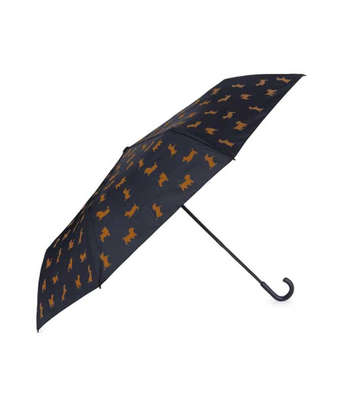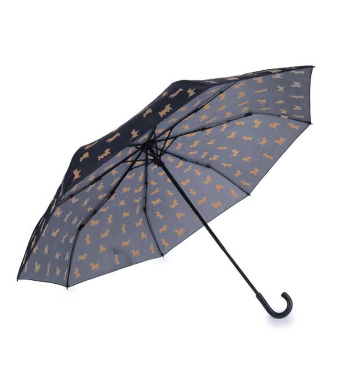Original design. El paraguas tiene un patrón divertido de perros. La funda tiene forma de teckel y el mango simula la cola del animal cuando está cerrado.
